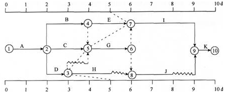 某工程双代号时标网络计划,在第5天未进行检查得到的实际进度前锋线如下图所示。正确的有( )。