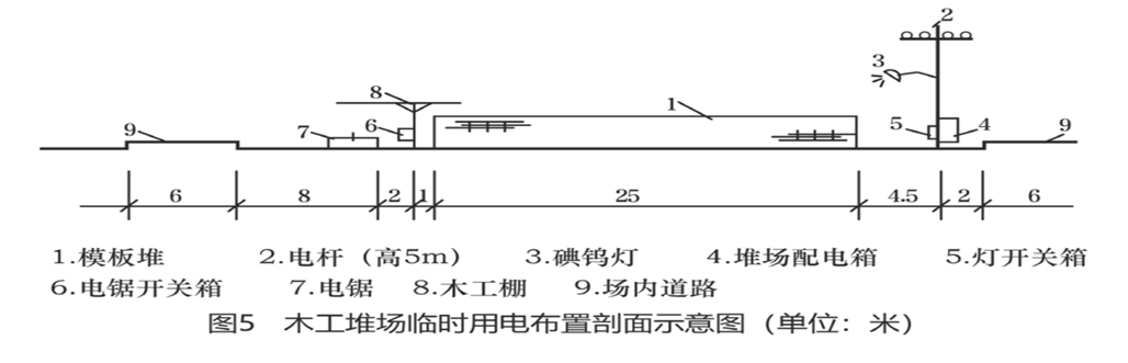 不妥3:电杆距离胶合板堆场太近(4.5m);