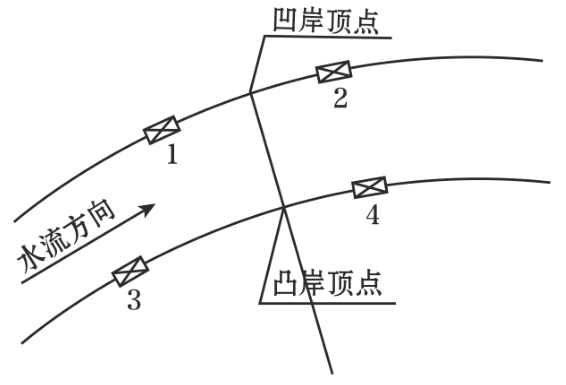 如图所示,弯曲河段修建进水闸,闸址宜选择在( )处。