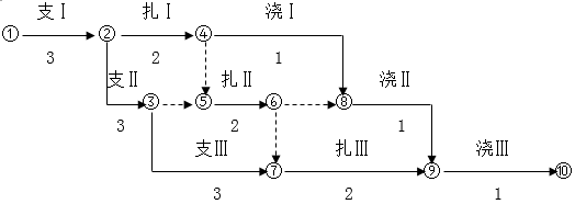 某钢筋混凝土基础工程,包括知模板、绑扎钢筋、浇筑混凝土三道工序。每到工序安排一个专业施工队进行,分三段施工,各工序在一个施工段上的作用时间分别3天、2天、1天,关于其施工网络计划的说法,正确的有( )。
