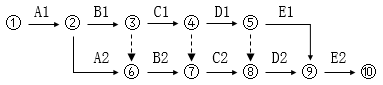施工单位绘制的网络图有两处不符合逻辑关系,请把缺失的逻辑关系用虚线箭头表示出来(请把背景中网络图复制在答题纸上作答,在试卷上作答