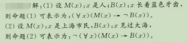 在一阶逻辑中,将下面命题符号化,并且要求只能使用全称量词:(1)没有人长着蓝色牙齿。(2)有的上海市民没有见过大海。