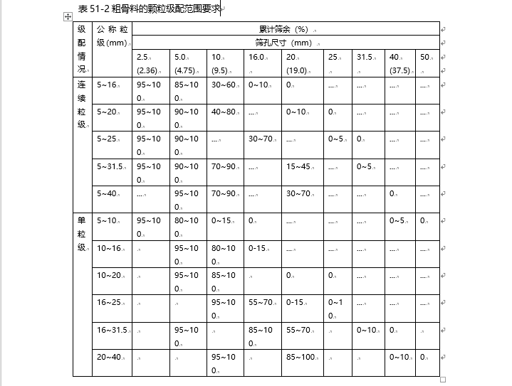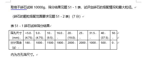 【正确答案】:①计算分计筛余百分数αi=(mi/m)×100% (i=1,2,3,4,5,6,7,8 m1=0g,m2=500g,m3=1000g,m4=2000g,m5=2000g,m6=1800g,m7=1500g,m=10000g)所以:α1=0%,α2=5%,α3=10%,α4=20%,α5=20%,α6=18%,α7=15%,α8=10%②计算分计筛余百分数βi=(α1+···+αi)β1=0%,β2=5%,β3=15%,β4=35%,β5=55%,β6=73%,β7=88%,β8=98%③与题51-2表对照,该碎石符合连续粒级5-40mm,故该碎石为连续粒级-40mm,合格。最大粒径为40mm。注:计算分计筛余采用1000g,若采用9980g,则扣1分。