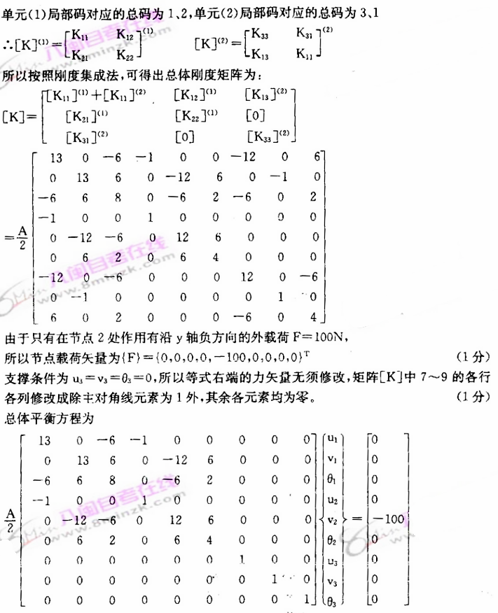 如图所示的平面刚架,由两个单元(1)和(2)组成。两单元的长度和截面尺寸及材料特性相同,单元(1)的局部坐标正方向为沿轴线方向由节点1指向节点2,单元(2)的局部坐标正方向为沿轴线方向由节点3指向节点1,在局部坐标系下每个单元的刚度矩阵为