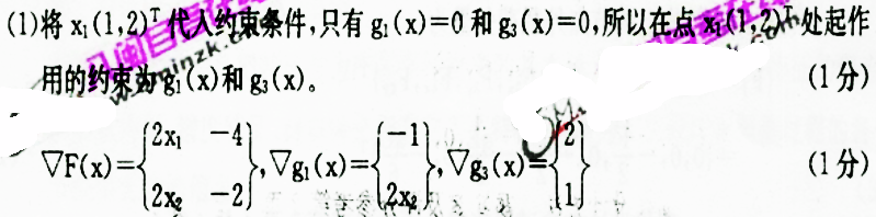 试用Kuhn-Tucker条件判断点x(下标1)(1,2)(上标T)和x(下标2)(1.5,1)(上标T)是否为该有约束问题的极值点。