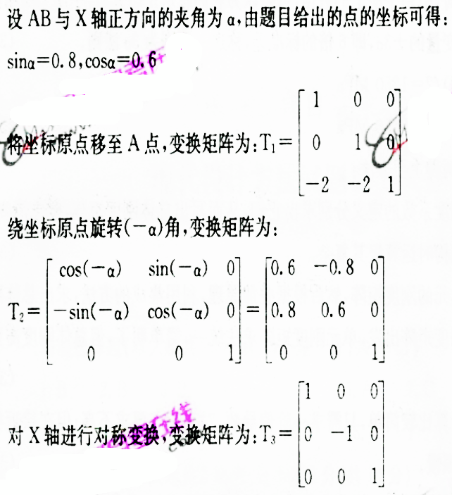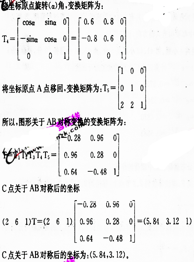 一平面三角形△ABC各点的坐标分别为A(2,2)、B(5,6)、C(2,6),试用基本变换推导出图形关于AB对称变换的变换矩阵,并求C点关于AB对称后的坐标。