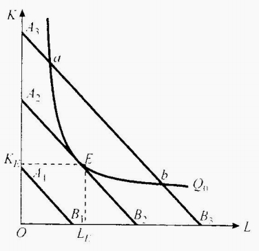 0/sub>有两个交点a和b,在这两点虽可以实现所需产量但成本却不是最低的。应减少成本支出。P95
