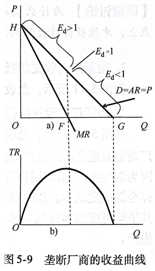 垄断厂商的需求曲线是向右下方倾斜的,其相应的平均收益曲线AR、边际收益曲线MR和总收益曲线TR的一般特征如图所示。由图可知,厂商的总收益与价格同时下降时,需求价格弹性小于1。P129