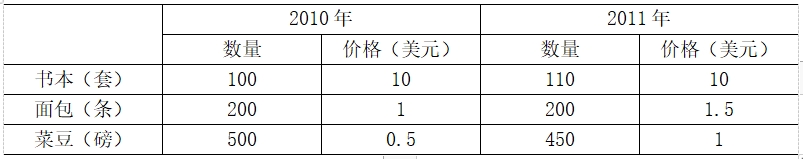 假定一经济社会生产三种产品:书本、面包和菜豆,它们在2010年和2011年的产量和价格是:试求: