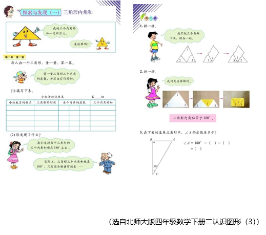 【知识与技能】通过量、剪、拼等活动发现、证实三角形内角和是180°,并会应用这一知识解决生活中简单的实际问题。