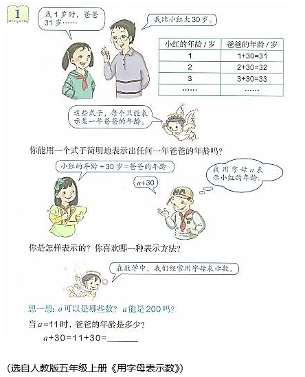 过程与方法目标:学生通过“自己与爸爸年龄的关系”的学习活动,初步体会“字母表示数”的简洁性,初步完成思维水平的提升,从数的具体到字母抽象的过渡。为完成从算术思维向代数思维的过渡做铺垫。