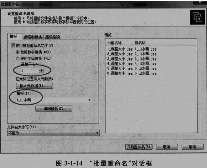 (2)单击主工具栏中的“批量重命名”按钮,进入“批量重命名”对话框。在“批量重命名”对话框中,勾选“使用模板重命名文件”下的“使用数字替换#”,设置“开始于”数字值为1,将模板命名修改为“#_山水画”,如图3-1-14所示。