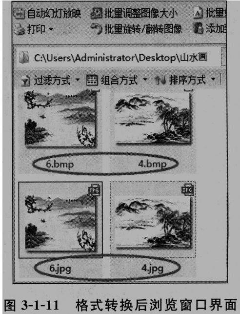 ③选择输出JPG,单击“下-步”按钮,设置输出参数和输出路径,单击“开始转换”即可。此时在浏览窗口中,我们可以看到转换后输出的转换完成的jpg格式图片,如图3-1-11所示。