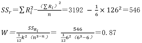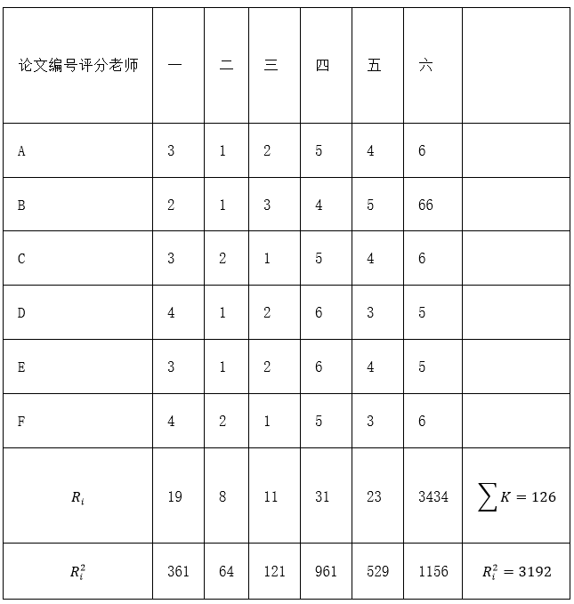 由于每个评分老师对6篇论文的评定都无相同的等级,故用公式(1),由表中数据得: