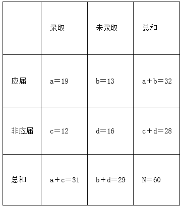 某项研究从参加研究生入学考试的考生中随机抽取60人,其是否为应届本科毕业生与最终录取情况如下表。试分析考生应届与否与录取情况的相