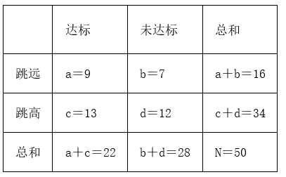 50名学生跳高与跳远成绩(达标与未达标)如下表所示,试求跳高与跳远成绩的相关情况。