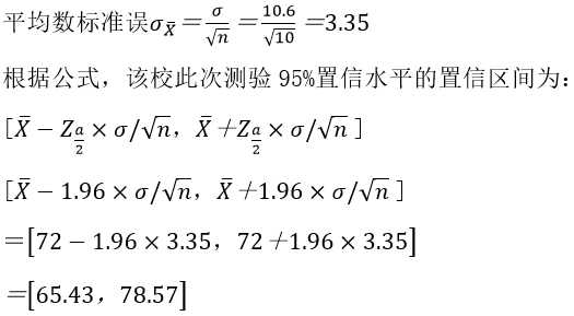 某中学二年级语文同以试卷测试分数历年来的标准差为10.6分,现从今年测验中随机抽取10份试卷,算得平均分为72分,试求平均数标准误,以及该校此次测验均分的95%置信水平的置信区间。