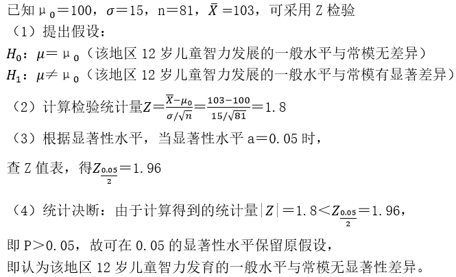 已知某智力测验的12岁儿童团体的常模是"μ" _0=100,σ=15,在某地区随机抽取81名12岁儿童实施这一智力测试,结果他们的平均智商为103。请问:通过这一测试,能否认为该地区12岁儿童智力发展的一般水平与常模有显著性差异?(a=0.05)
