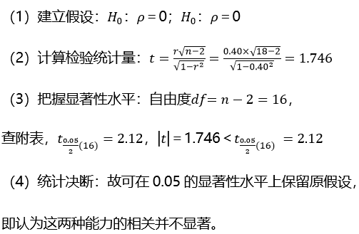 18名被试进行了两种能力测验,结果r=0.40,试问这两种能力是否存在显著的相关?