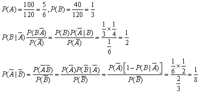 全年级120名学生中有男生(以A表示)100人,来自北京的(以B表示)40人,这40人中有男生30人,试写出P(A)、P(B)、