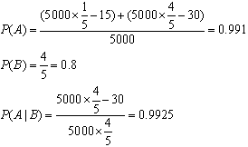 某工厂一次生产5000个作业本,其中蓝皮本占1/5,白皮本占4/5,蓝皮本中不合格的有15本,白皮本中不合格的有30本,用A代表合格的本,用B代表白皮本。则P(A)、P(B)、P(A|B)各为