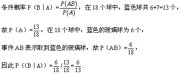 盒中共有18个球,其中8个玻璃球,10个木质球,而玻璃球中有2个红色球、6个蓝色球;木质球中有3个红色、7个蓝色球,记A=“取到