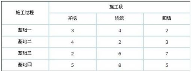 【题目解析】::本题考查的是流水步距的确定。基础一和基础二流水步距=3,所以基础二浇筑完工时间=3+(4+2)=9天。