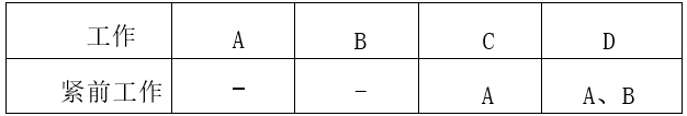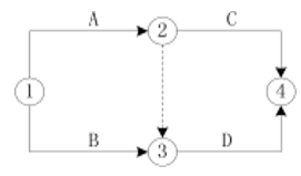 【题目解析】:工作 C 的紧前是 A,工作 D 的紧前是 A 和 B,这条虚箭线的作用是把两个工作联系到一起,表达逻辑关系,不是区分这两个工作。