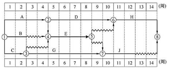 【题目解析】:工作 B 的自由时差为本身波形线的长度,为 2 周。由图可知,工作 B 处于两条 线路上(①→④→⑤→⑥→⑧, ①→④→⑤→⑦→⑧),两条线路的波形线总和分别为 4、5,工作 B 的总时差取两者最小值,即 4 周。