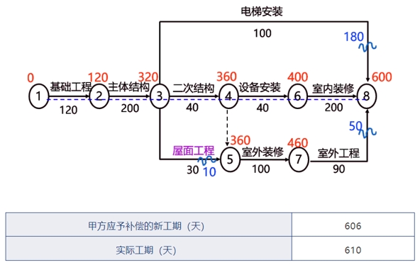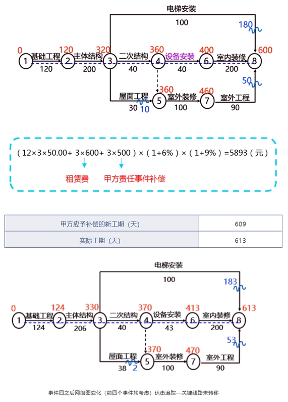 (2)实际工期:关键线路上工作持续时间变化的有:基础工程增加4天:主体结构增加6天;设备安装增加3天;室内装修减少10天。