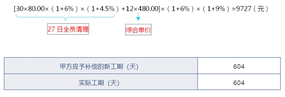 事件1费用索赔:[30×80.00×(1+6%)×(1+4.5%)+12×480.00]×(1+6%)×(1+9%)=9727(元)