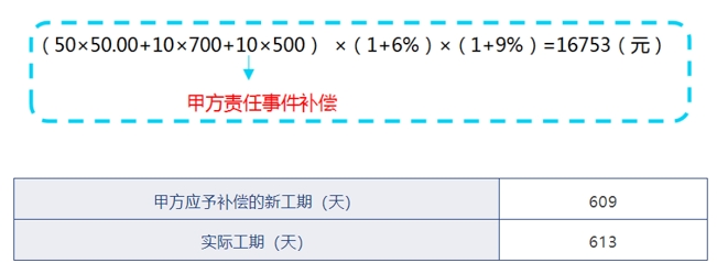 事件5费用索赔:(50×50.00+10×700+10×500)×(1+6%)×(1+9%)=16753(元)