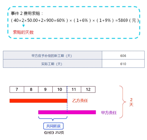 事件2费用索赔:(40×2×50.00+2×900×60%)×(1+6%)×(1+9%)=5869(元)