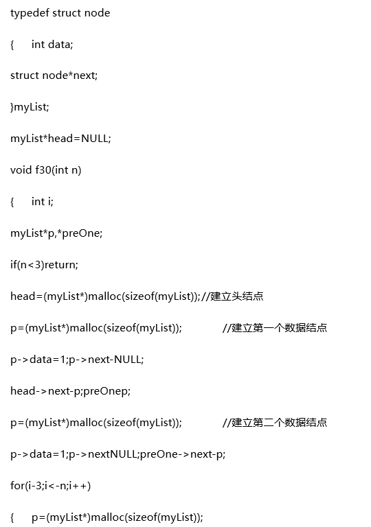 程序f30()创建了一个带头结点的含n(n≥3)个数据结点的单链表L,L前两个数据结点中的data值均为1,从第3个结点开始,结点的data值是其前两个结点data值之和。请在空白处填上适当内容将算法补充完整。