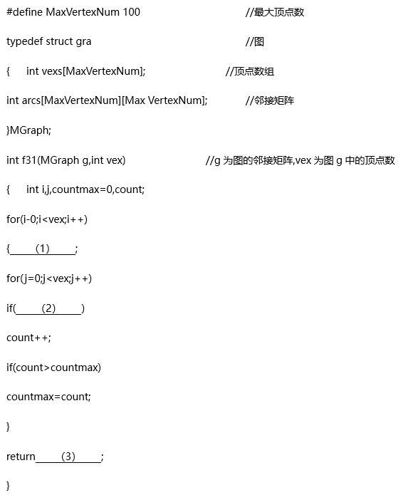 已知图的邻接矩阵表示的存储结构定义如下,算法f31()统计图中各顶点的度,并返回最大度数。请在空白处填上适当内容将算法补充完整。