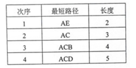 (2)求出G中从源点A到其余各顶点的最短路径。要求根据迪杰斯特拉算法的求解过程依次给出各条路径,包括路径上经过的顶点及其长度。