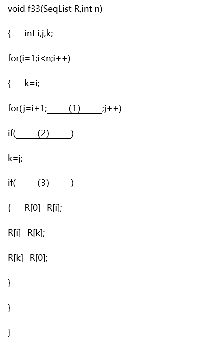 函数f33()对R采用直接选择排序进行升序排序,请在空白处填上适当内容使算法完整。