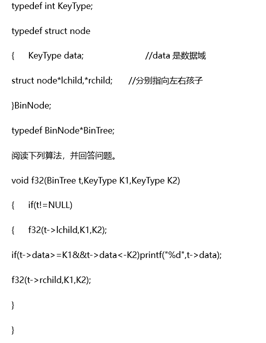 已知二叉排序树结点的数据类型定义及二叉排序树的某个算法f32()如下。typedef struct node{ int data