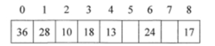已知散列函数为H(key)=key%9,现将关键字序列(13,17,24,36,28,10,18)依次散列到散列表HT[9]中,