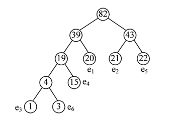 设电文字符集是{e1,e2,e3,e4,e5,e6},各字符出现的频次分别为{20,21,1,15,22,3}。现要为该字符集设