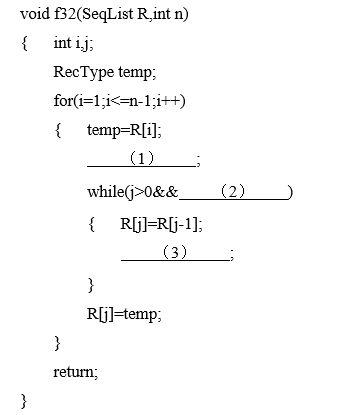 待排序记录的数据类型定义如下:下列函数f32()的功能是用直接插入排序对顺序表按升序进行排序,请在空白处填上适当内容使算法完整。