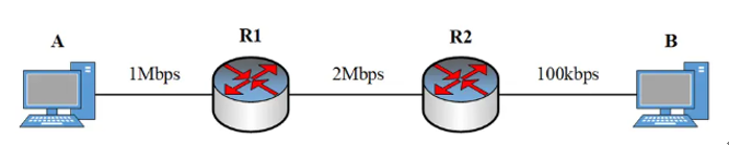 问题: 如下图所示网络,主机A通过路由器R1和R2连接主机B,三段链路带宽分别是100kbps、 2Mbps和1Mbps。假设A以存储-转发的分组交换方式向B发送一个大文件。请回答下列问题: