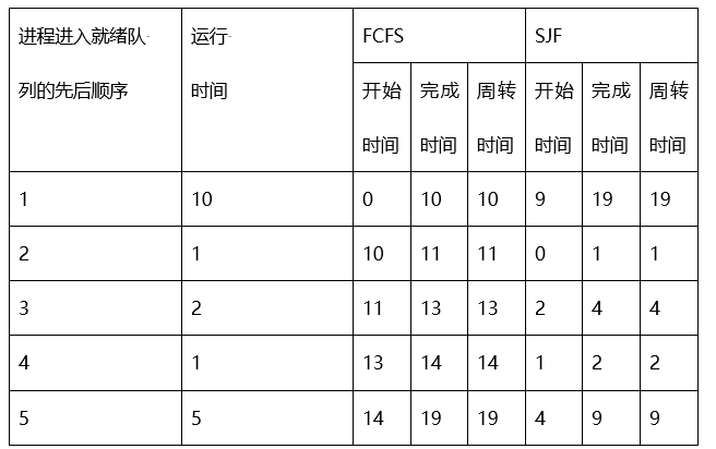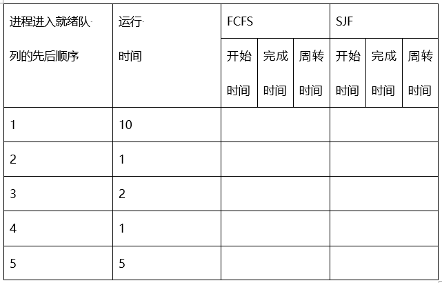 (1)给出FCFS和SJF算法各进程的开始时间、 完成时间、 周转时间。