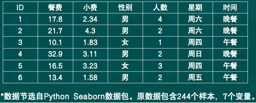 结合下表,当我们关注小费和其他列表关系时,描述什么是数据集、特征和标签。