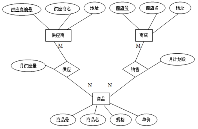 供应商与商品之间存在“供应”联系,每个供应商可供应多种商品,每种商品可向多个供应商订购,每个供应商供应每种商品有个月供应量;商店与商品间存在“销售”联系,每个商店可销售多种商品,每种商品可在多个商店销售,每个商店销售每种商品有个月计划数。