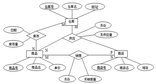设仓库与商品之间存在“库存”联系,每个仓库可存储若干种商品,每种商品存储在若干仓库中,每个仓库每存储一种商品有个日期及存储量;商店与商品之间存在着“销售”联系,每个商店可销售若干种商品,每种商品可在若干商店里销售,每个商店销售一种商品有月份和月销售量两个属性;仓库、商店、商品之间存在着“供应”联系,有月份和月供应量两个属性。