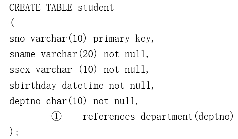 以下语句建学生信息表student(其中deptno是该学生所属的系部编号,该字段参照了department表的deptno字段),请将语句补充完整。