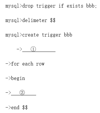 有学生表、课程表和成绩表,在学生表上创建一个触发器,实现ON DELETE CASCADE的功能,即删除课程表中的一门课程,则自动级联删除成绩表中该课程的选课信息。下面给出创建触发器的部分代码,请按照途中标号的顺序在右侧的横线处填写恰当的语句,完善创建触发器的程序。