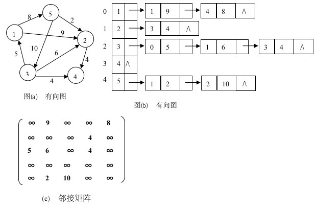 解:有向图如图(a),其邻接矩阵如图 (b),正邻接链表如图(c)。