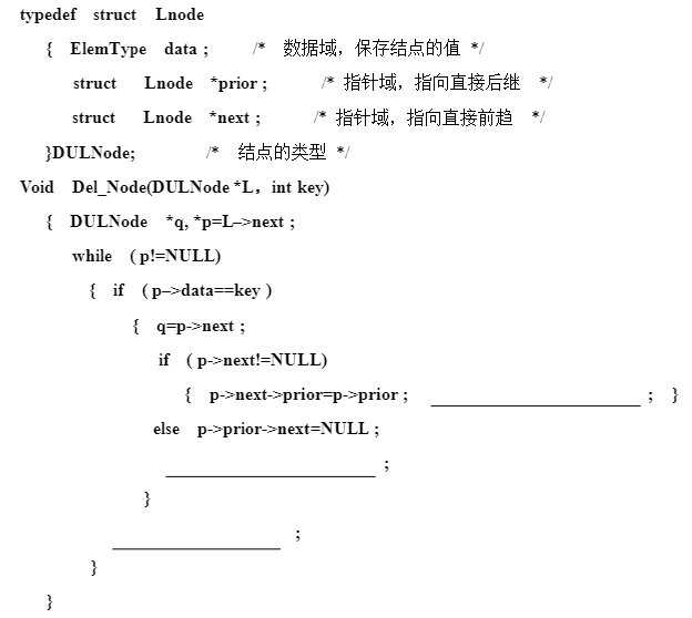 在以L为头结点的双向链表中删除所有值为key的结点,结点结构定义如下。